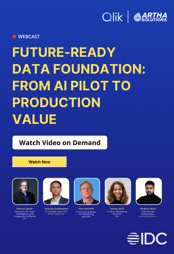 Most AI initiatives stall before production because the underlying data lacks trust, scale, and governance. Watch this on-demand webcast featuring experts from IDC, Qlik, and Artha Solutions to learn how to bridge the gap from pilot to production value. Learn a structured 90-day roadmap to AI Ready Data Foundation and learn the core pillars of Data Readiness for AI.